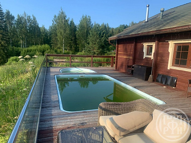 (170) Продается дом фермера из клееного бруса, площадью 300 кв.м., на земельном участке сельхоз/назначения, площадью 26964 кв.м. Красивый современный дом построен на высоком месте,в окружении живописного пейзажа,на горе.Участок находится на первой береговой линии. В доме просторная гостинная с камином, большая кухонная зона, сауна, спальные комнаты для себя и гостей, сауна, душ и несколько с/узлов.Есть скважина с чистейшей питьевой водой.Свой летний бассейн. На участке растет большая красивая ель, внизу на склоне протекает р. Оредеж. В окружении достойные соседи.Дом находится на охраняемой территории Глебово. Шикарная усадьба для отдыха и постоянного проживания.