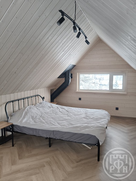 О доме: - площадь 57 кв.м + 10кв.м терраса, в доме 2 этажа, на первом - кухня-гостиная с чугунной печью-камином, которая быстро нагревается и долго отдает тепло,тем самым экономя ресурсы на отопление, так же на 1 этаже есть небольшая спальня, тех.помещение и санузел с сауной. На втором этаже - одно общее пространство.